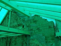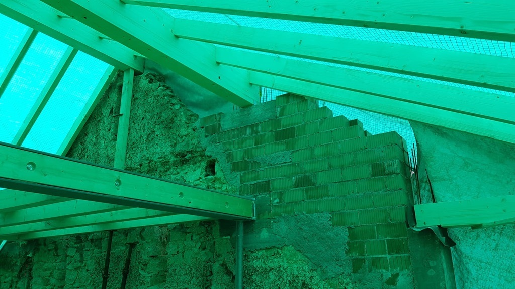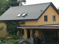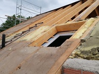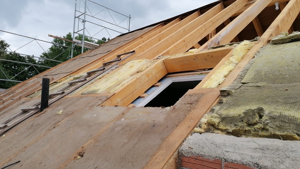 Entfernen von Asbestplatten und alter Lattung. Neue Lattung mit Isolation angebracht und mit Prefaplatten neu eingedeckt.