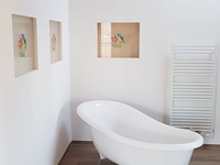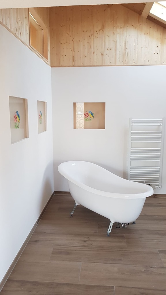 Es wurde das Dach erneuert und ein Wintergarten erstellt, wodurch mehr Wohnraum entstand. Wände im Küchen- und Wohnbereich wurden entfernt, um einen großen, lichtdurchfluteten Wohn-Essbereich zu schaffen. Das Badezimmer wurde vergrößert und mit Nischen im Duschbereich versehen. Auch der Schlafbereich wurde heller und geräumiger gestaltet.