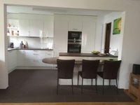 In diesem Zuge wurden Wände entfernt und Träger eingebaut. Durch die Vergrößerung des Bades und der Versetzung des Treppenaufgangs konnte mehr Wohnraum geschaffen werden. Aus den alten Stallungen entstand eine offene Küche die perfekt in den Wohnbereich integriert wurde.